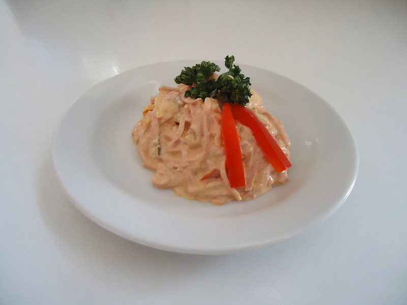 Složení: výrobní salám, okurka sterilovaná kostky, paprika sterilovaná zelená, cibule, chilli koření, majonéza, sůl, cukr, worcester, pepř černý mletý koření, hořčice, kečup