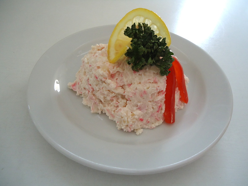 Složení: treska s příchutí kraba, majonéza, celer sterilovaný kostky, citron, sůl, cukr, cibule, citrónová kůra