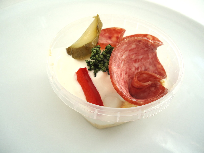 Složení: bramborový salát, vejce vařené, přeliv, okurka sterilovaná, turistický salám, petržel nať, paprika červená čerstvá