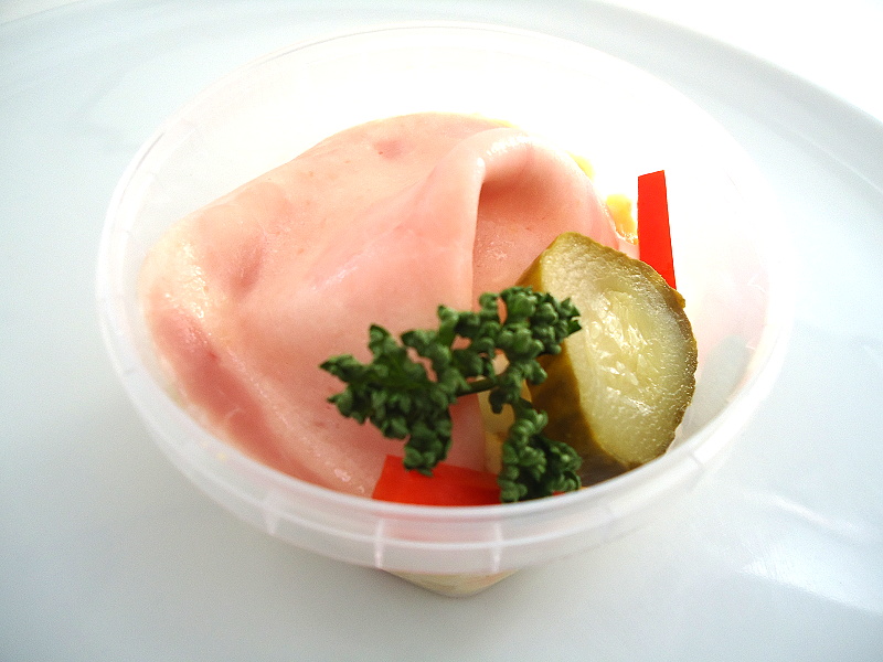 Složení: bramborový salát, vejce vařené, přeliv, okurka sterilovaná, šunkový salám, paprika červená čerstvá
