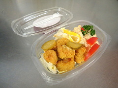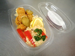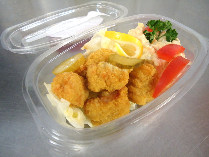 Složení: bramborový salát, čínské zelí, kuřecí řízečky smažené, okurka salátová, rajče, petržel nať, paprika červená čerstvá