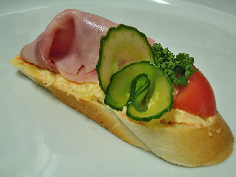 Složení: veka, salát výrobní, šunka, vejce vařené, přeliv bílý majonézový, rajče, okurka salátová, petržel nať