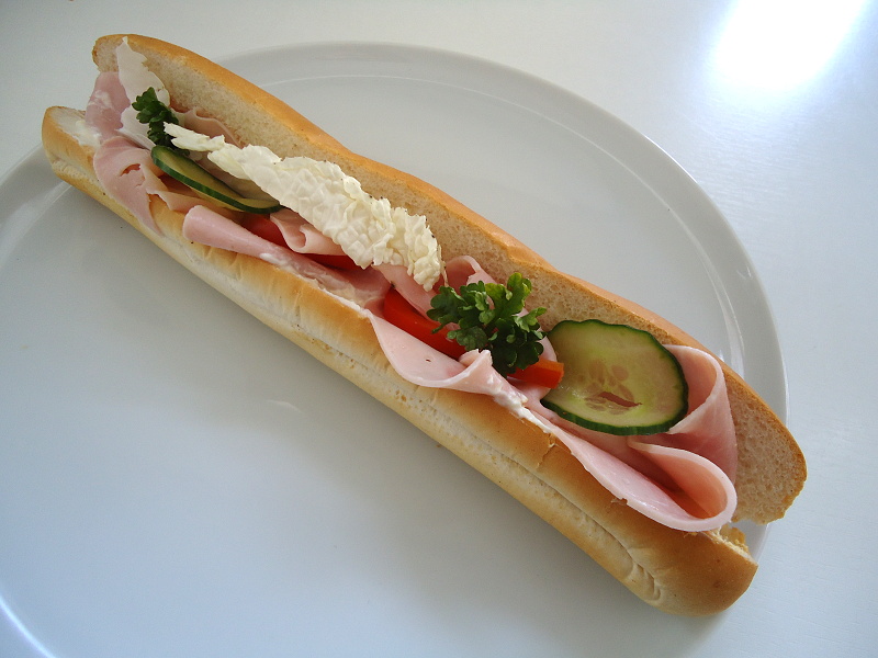 Složení: bageta, šunka, okurka salátová, paprika červená čerstvá, čínské zelí, rostlinný tuk, přeliv