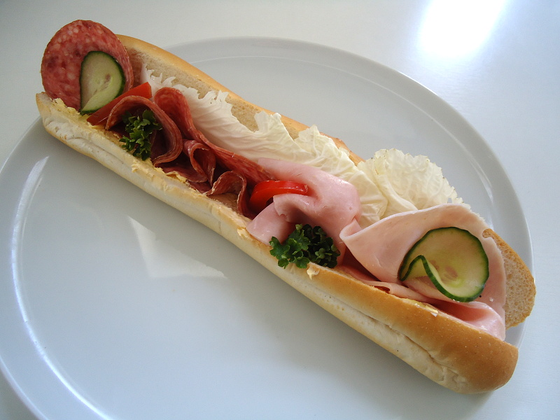 Složení: bageta, salát výrobní, šunka, turistický salám, čínské zelí, okurka salátová
