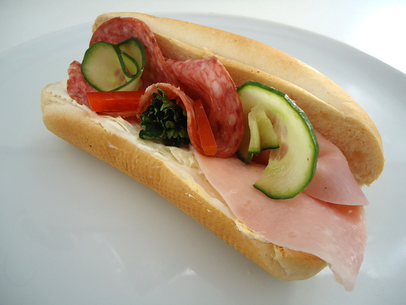 Složení: bageta, salát výrobní, šunka, turistický salám, čínské zelí, okurka salátová