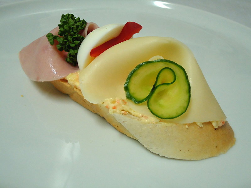 Složení: veka, salát výrobní, šunka, sýr eidam, vejce vařené, paprika červená čerstvá, okurka salátová, petržel nať